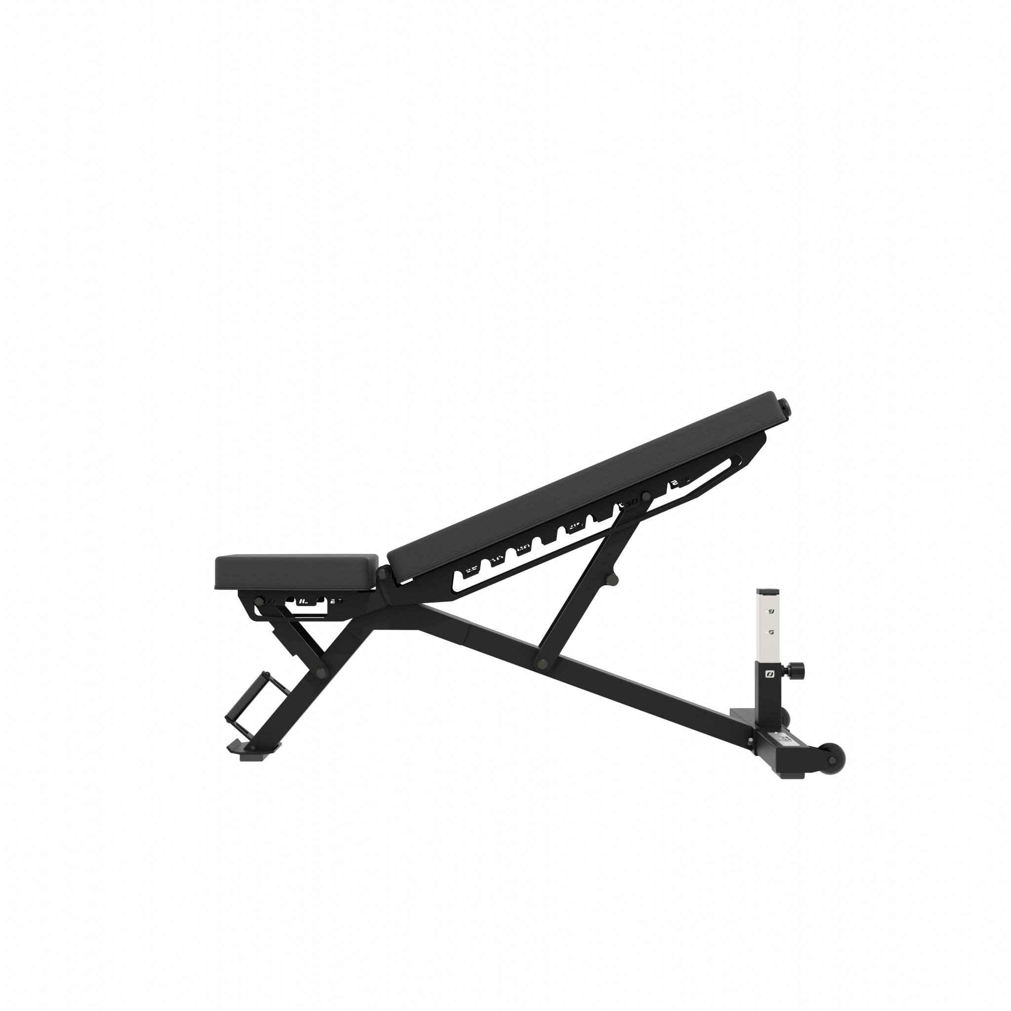 With an adjustable post that supports decline positions down to -9 degrees, this bench is ready for everything from presses to core work. Knurled steel handles and smooth wheels make transport a breeze, and the integrated bumper plate means clean, vertical storage when you're done.